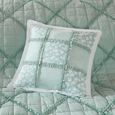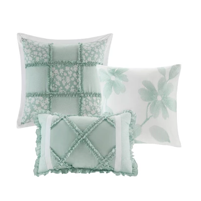 For a cottage chic look in your space, the 9pc Gretchen Printed Cotton Percale Comforter set provides color and style. The dusty seafoam center has quilting and ruffle details while the outer border features a floral print in white and finishes off the edge with ruffles. Two euro shams and three decorative pillows use coordinating colors and fabric manipulation techniques to pull this whole look together. Machine washable for easy care, soft to the touch with hypoallergenic filling, this comforter set adds a touch of elegance to your bedroom.